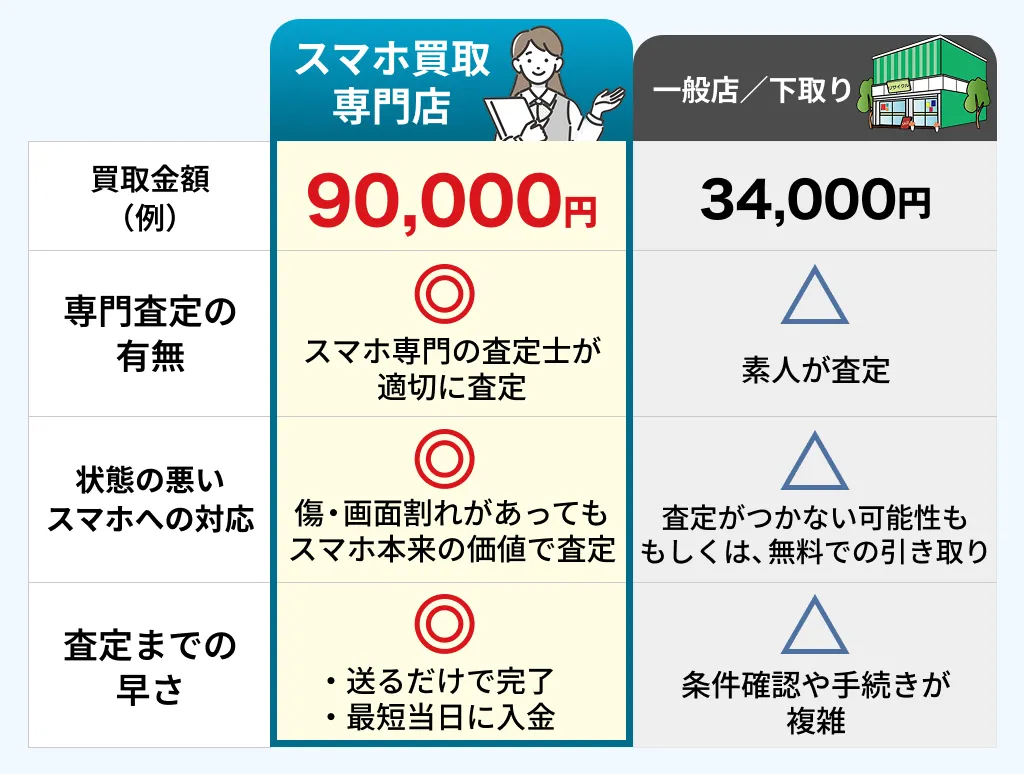一方、スマホ専門の査定士がいる買取店なら、独自基準で価値を正しく判断するため、画面割れやバッテリー劣化でも買取可能です!