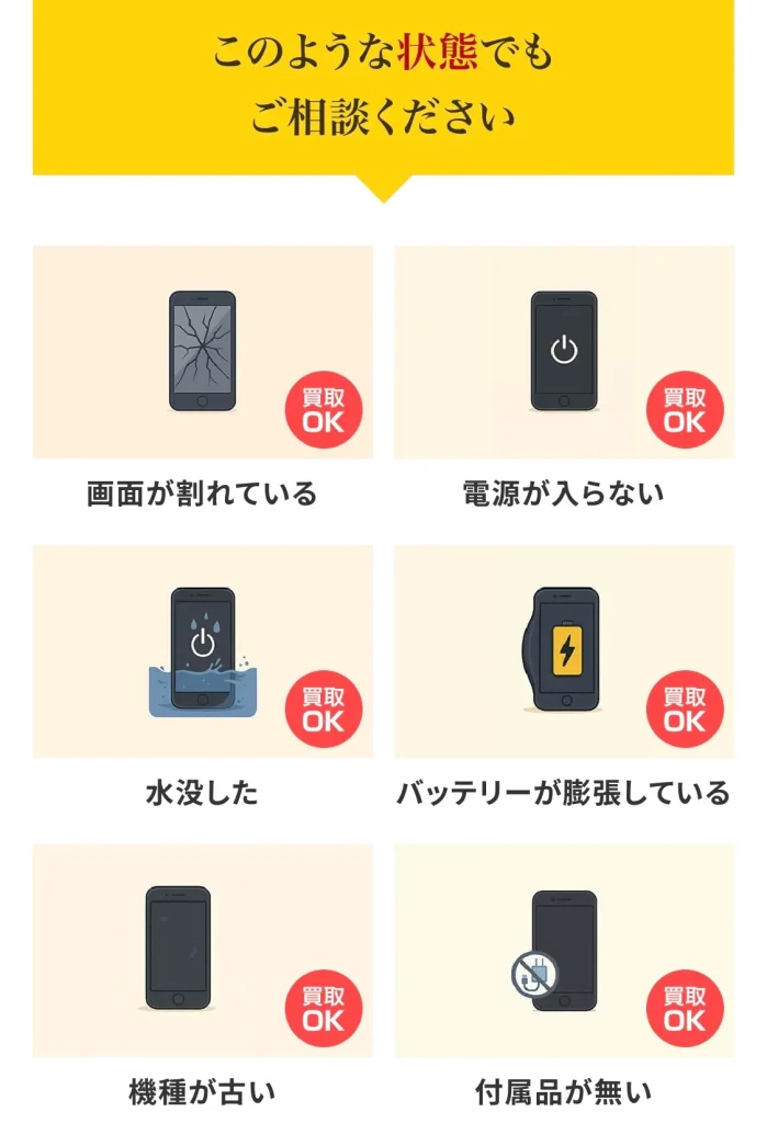 | iPhoneの状態 | 傷あり・画面割れ・分割支払い中でも 高額買取! | 買取可能 | 一部買取可能 |